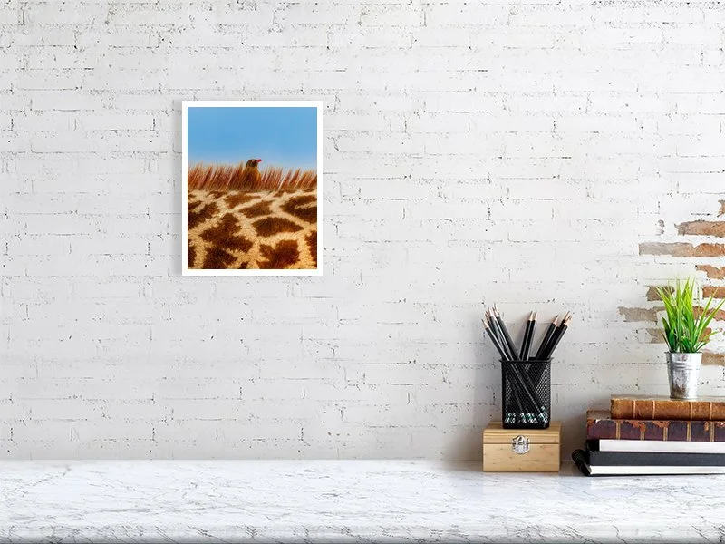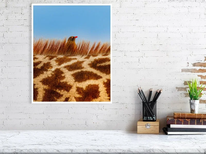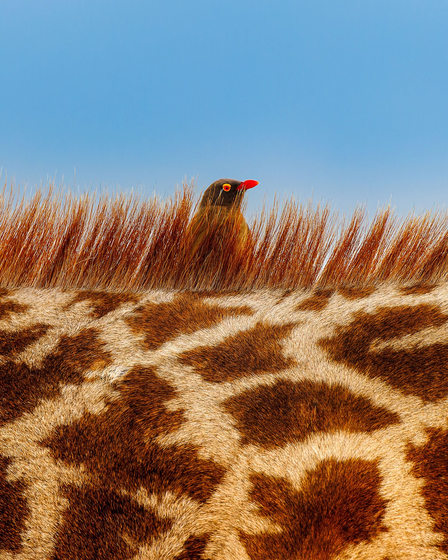 A close-up view of a giraffe’s neck reveals a red-billed oxpecker peeking just above the giraffe’s bristly mane. The bird perches attentively, diligently searching for insects hidden in the giraffe’s coat. This fascinating symbiotic partnership is a true win-win: the oxpecker enjoys a reliable food source, while the giraffe benefits from the removal of irritating parasites. A subtle yet powerful illustration of nature’s cooperative balance.