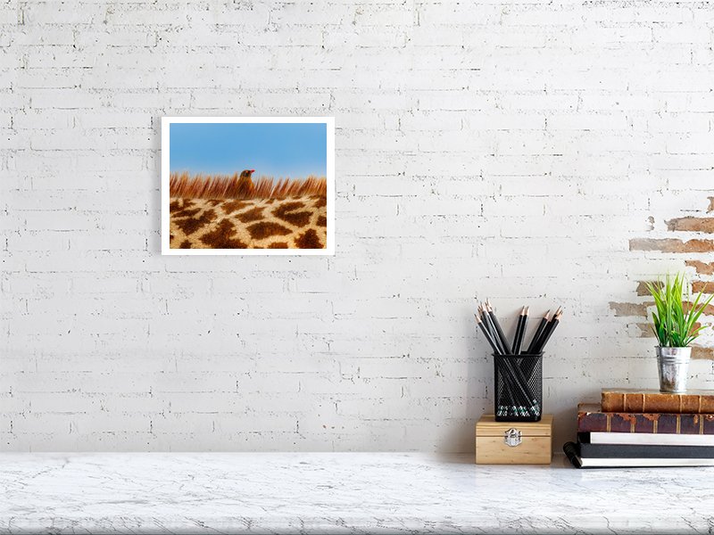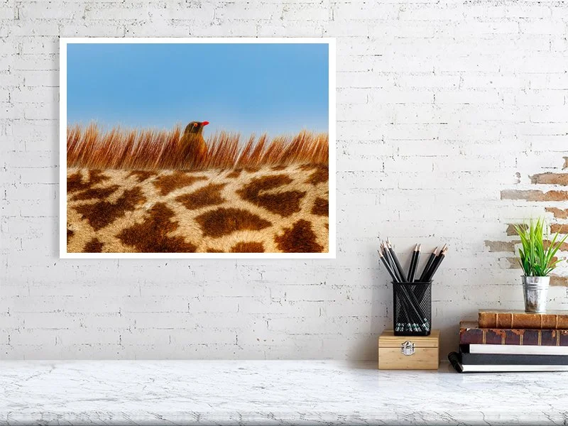 A close-up view of a giraffe’s neck reveals a red-billed oxpecker peeking just above the giraffe’s bristly mane. The bird perches attentively, diligently searching for insects hidden in the giraffe’s coat. This fascinating symbiotic partnership is a true win-win: the oxpecker enjoys a reliable food source, while the giraffe benefits from the removal of irritating parasites. A subtle yet powerful illustration of nature’s cooperative balance.