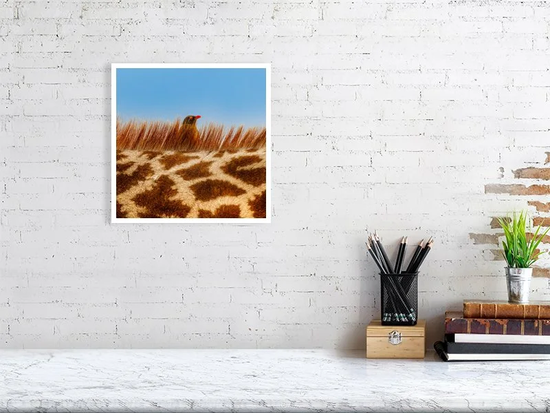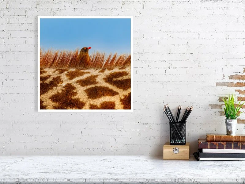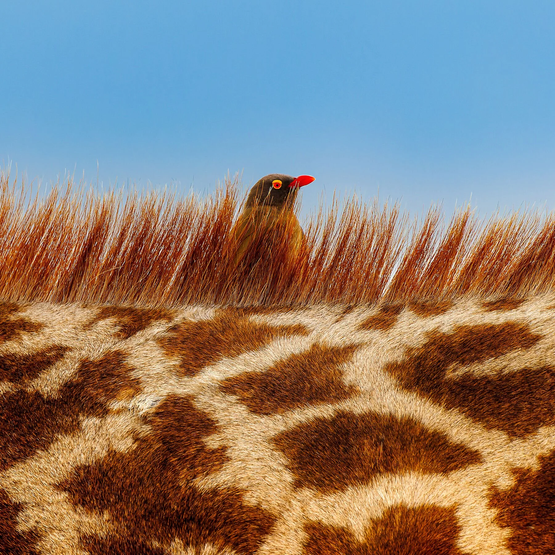 A close-up view of a giraffe’s neck reveals a red-billed oxpecker peeking just above the giraffe’s bristly mane. The bird perches attentively, diligently searching for insects hidden in the giraffe’s coat. This fascinating symbiotic partnership is a true win-win: the oxpecker enjoys a reliable food source, while the giraffe benefits from the removal of irritating parasites. A subtle yet powerful illustration of nature’s cooperative balance.