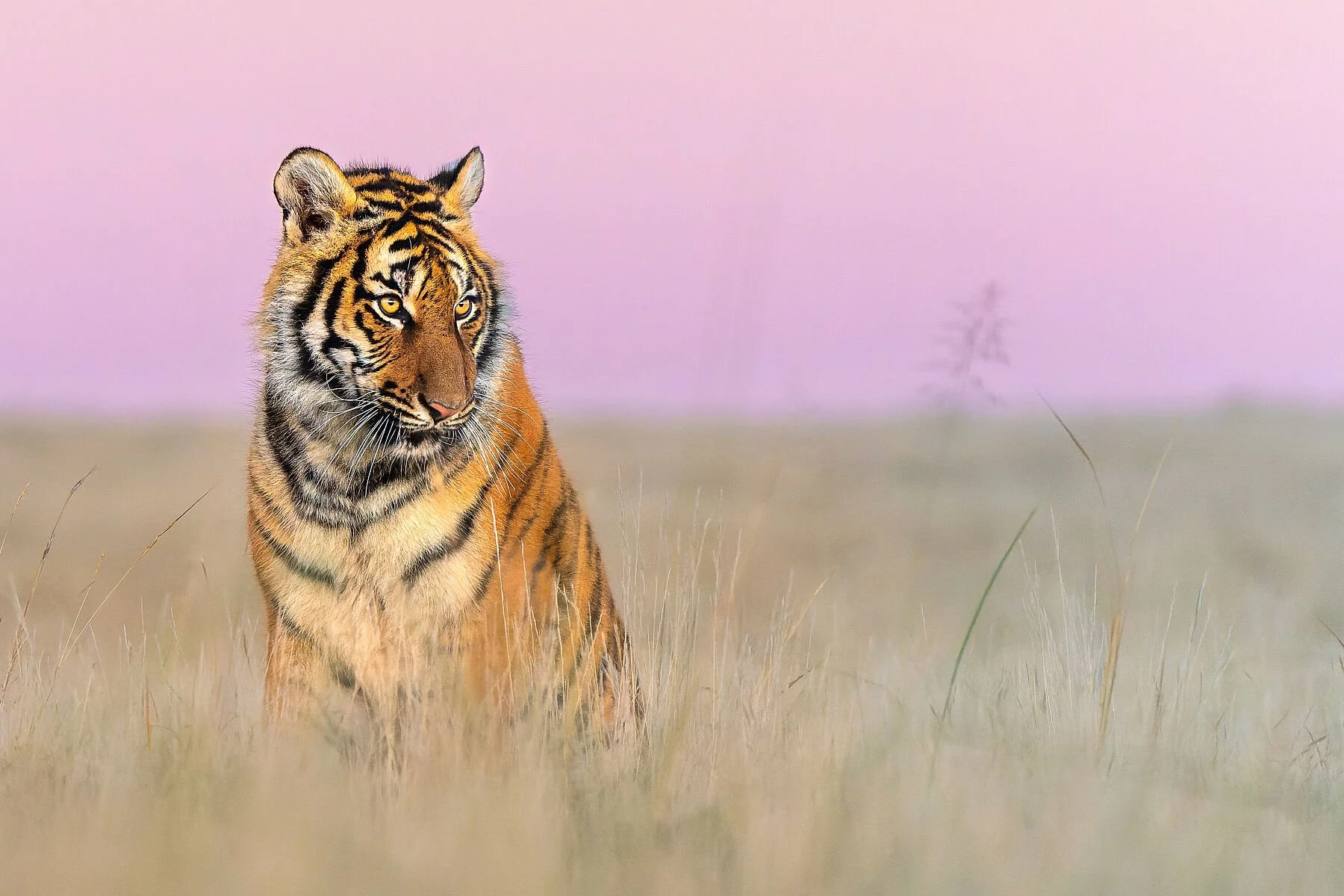 Tigress in the early morning light just before sunrise when the sky turns into a beautiful pastel colour