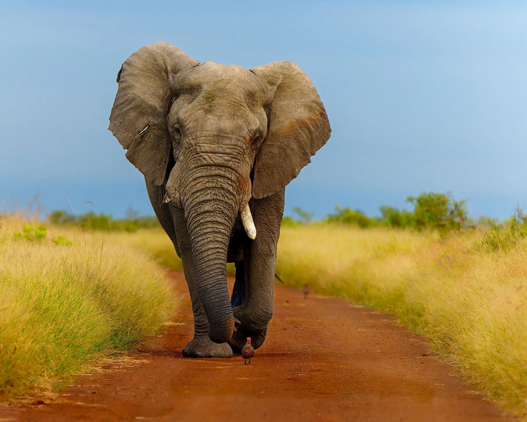 On a red dusty road bordered by long yellow grasses near Lower Sabie in Kruger National Park, a Swainson's spurfowl walks boldly before the towering feet of a calm, passing elephant. The small bird seems to wait for insects stirred up by the elephant’s steps, illustrating a subtle form of natural cooperation. The scene highlights the dramatic contrast between the tiny spurfowl and the elephant’s immense presence, capturing an intimate glimpse of coexistence in the African bush.