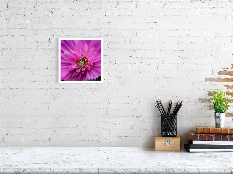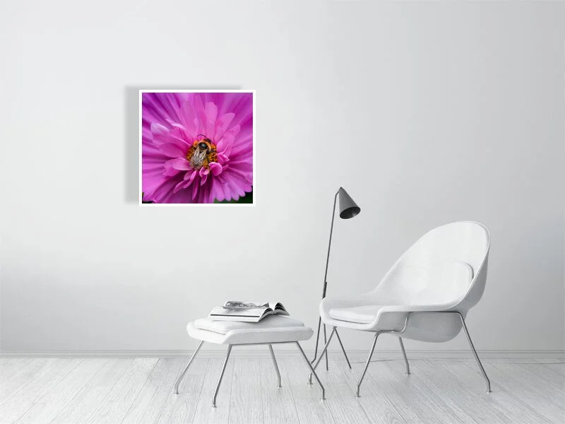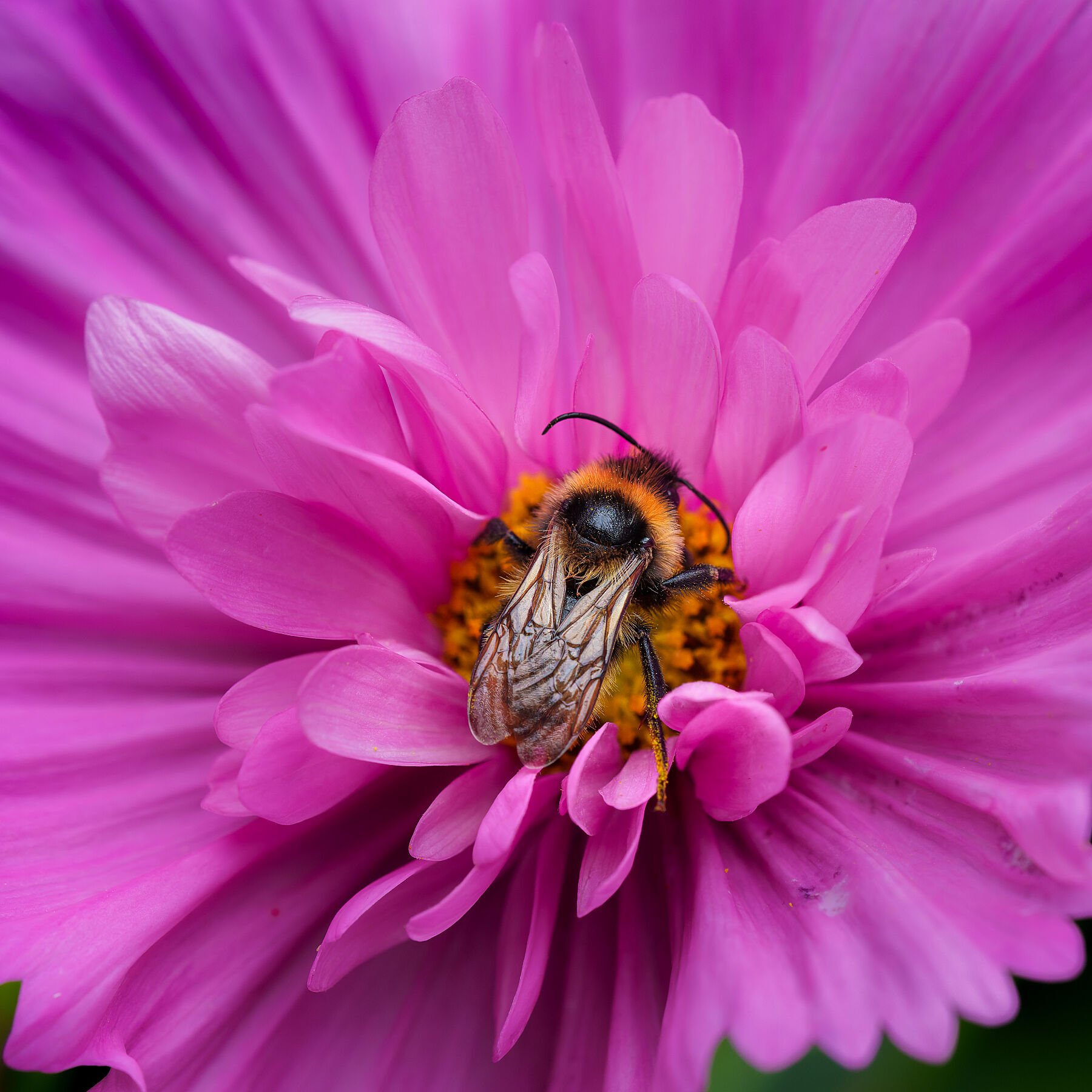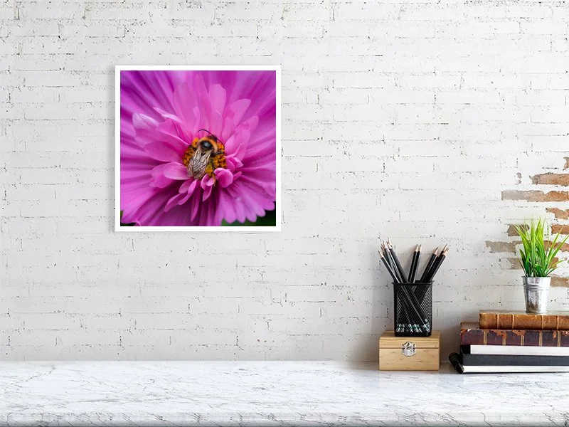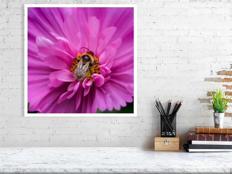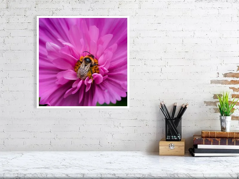 A bumblebee perched on a pink cosmos flower. The richly layered petals create a lush, textured backdrop that highlights the bee’s soft, fuzzy form as it gathers nectar. Part of a series captured in my bee-friendly garden