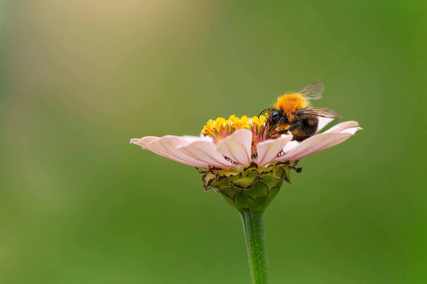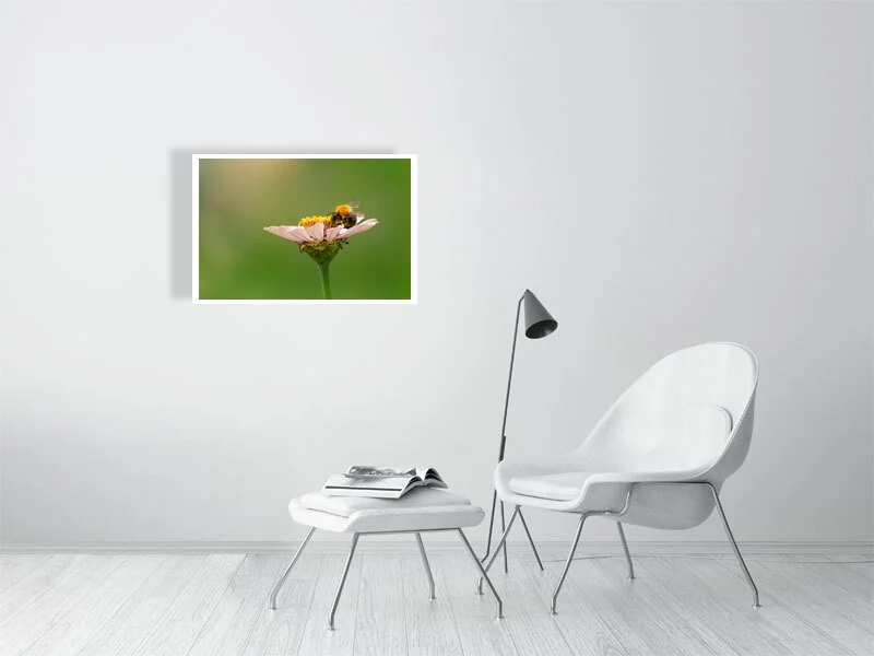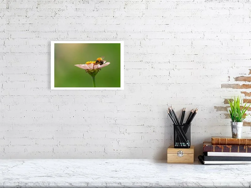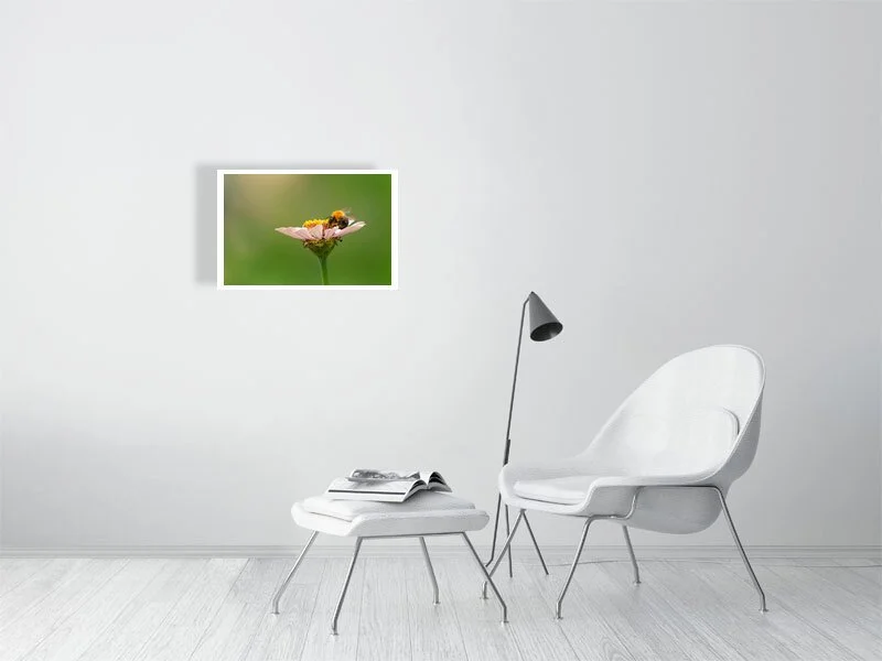 A side-view portrait of a bumblebee exploring a pastel pink zinnia. From this delicate angle, it almost seems as though the bee is gently seated on the petal, suspended in a quiet moment while searching for nectar. The soft pink tones of the flower contrast beautifully with the bee’s textured body, capturing a fleeting yet intimate encounter in nature.