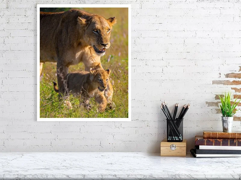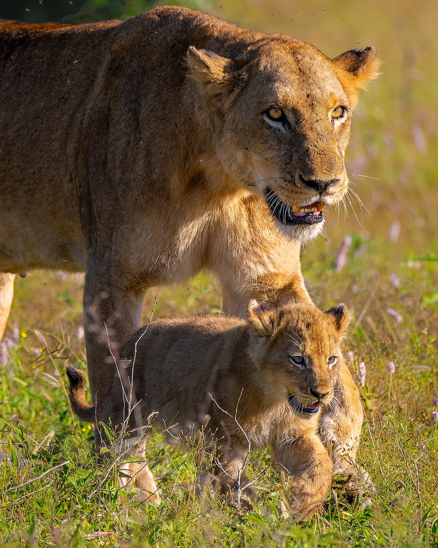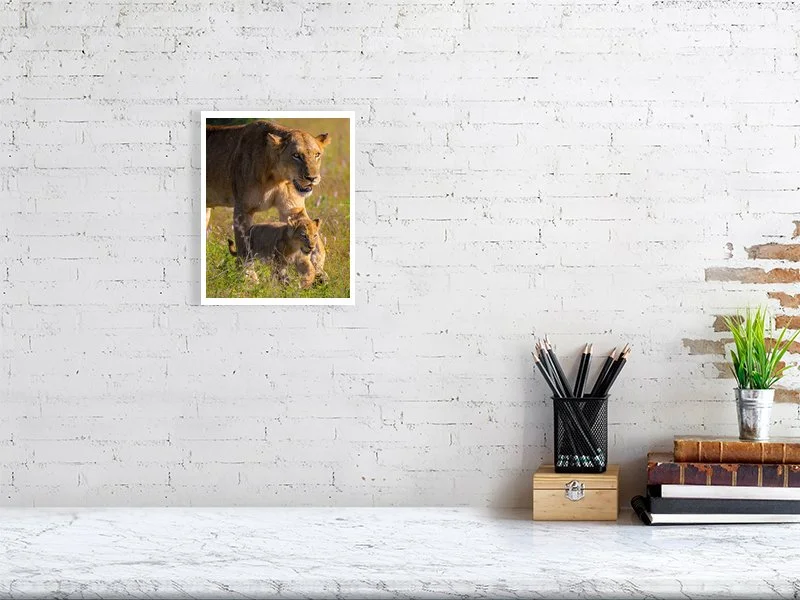 A lioness strides gracefully with her tiny cub by her side, their steps perfectly in harmony, a tender moment of guidance and connection in the wild.