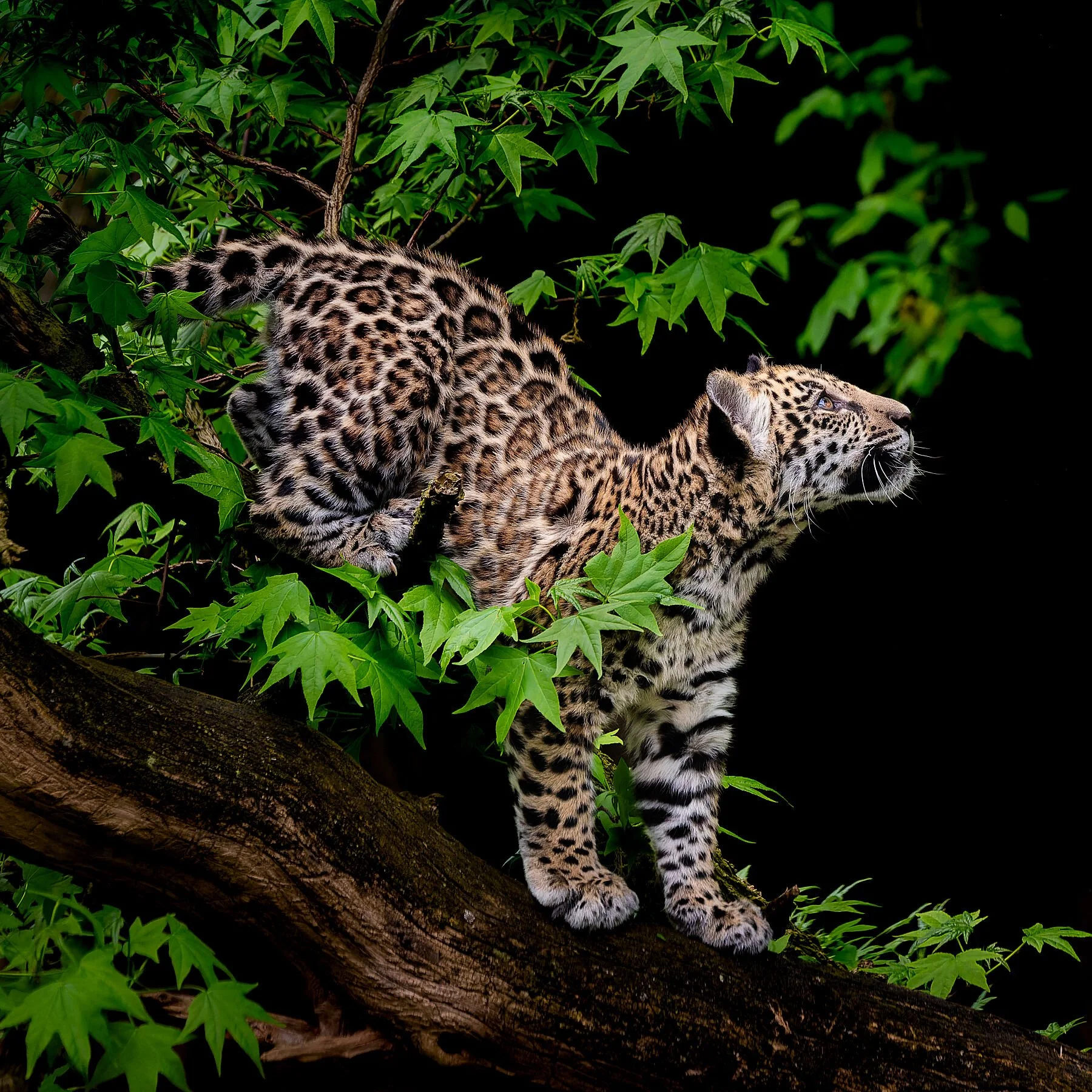 Curious baby jaguar up in a tree