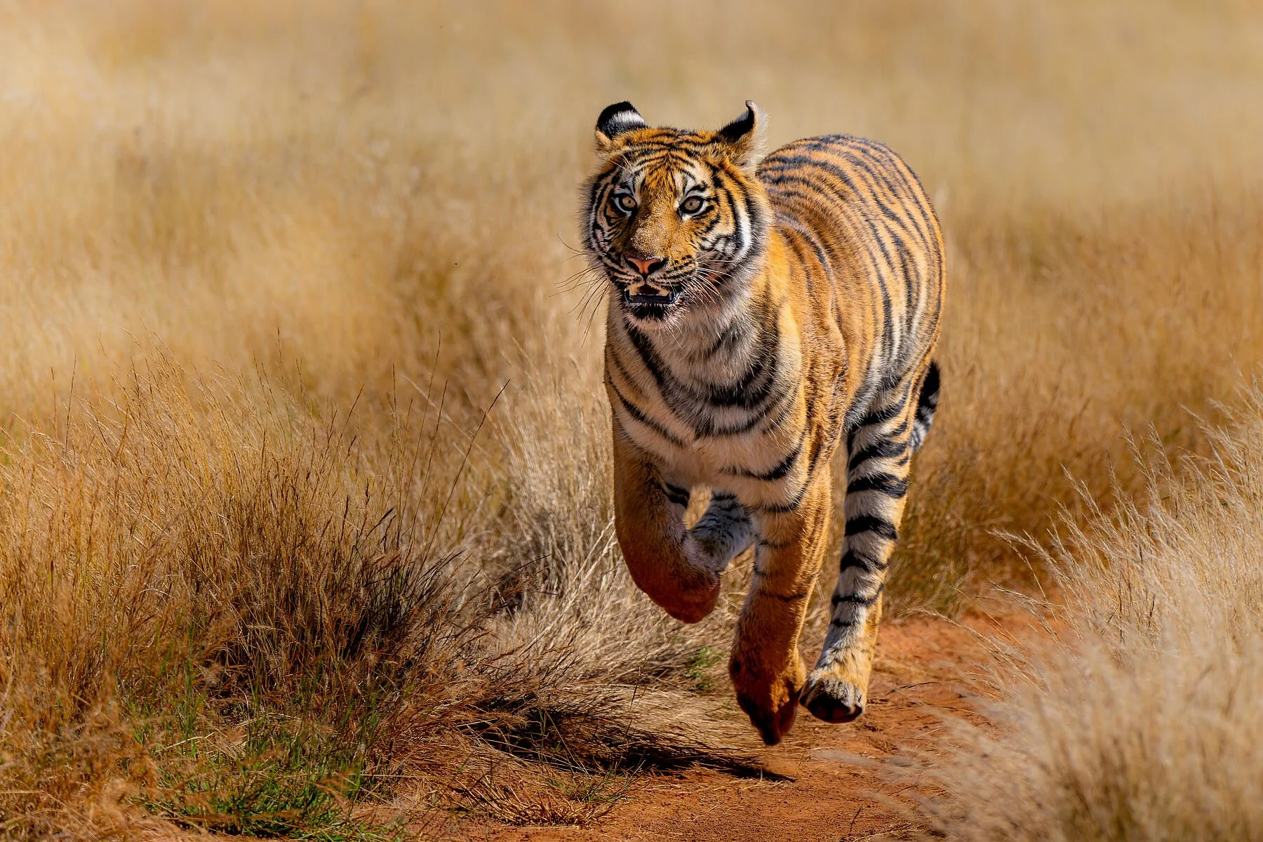 A young tigress flies across a sunlit trail, all four paws off the ground, surrounded by golden dry grass in full motion.