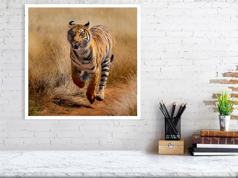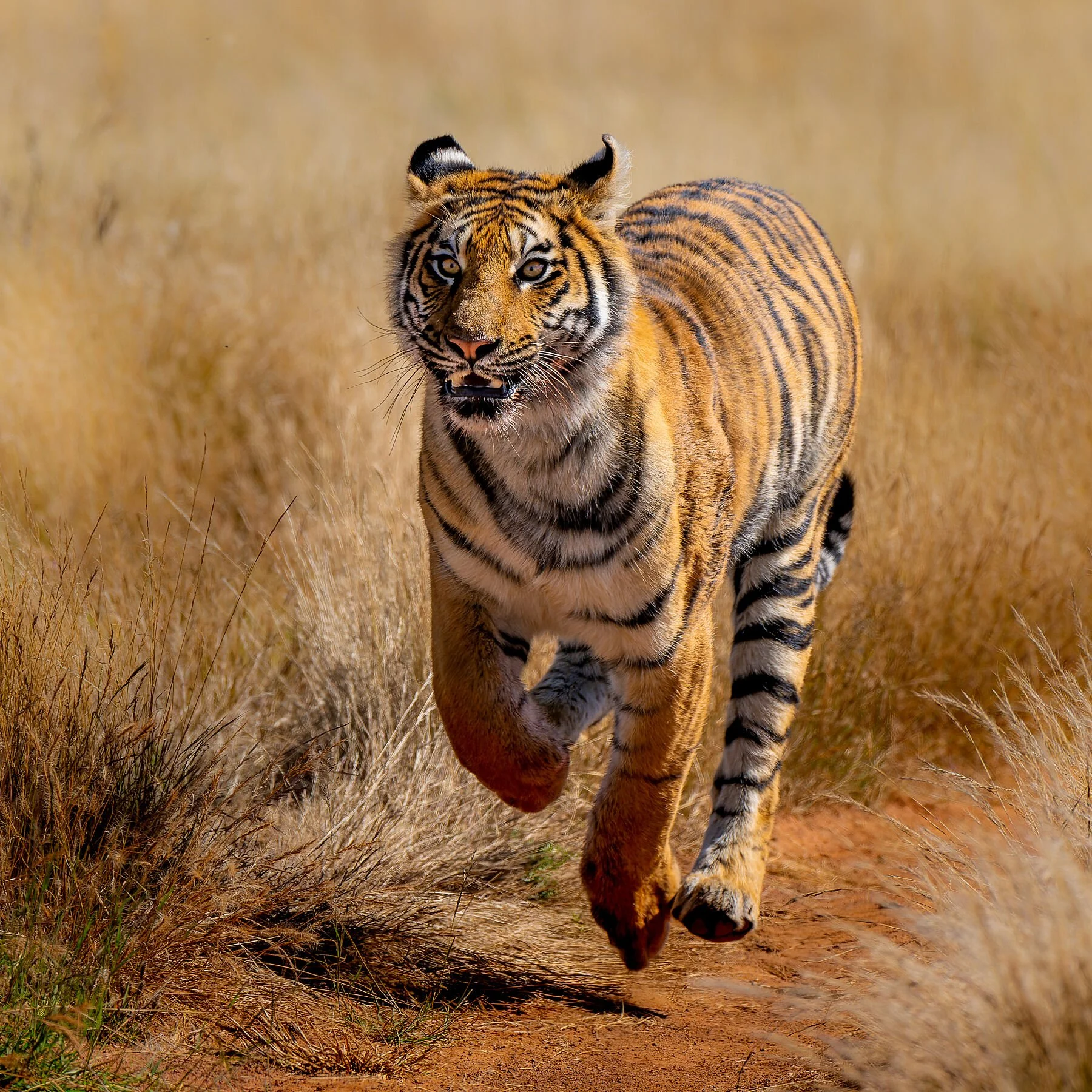 A young tigress flies across a sunlit trail, all four paws off the ground, surrounded by golden dry grass in full motion.