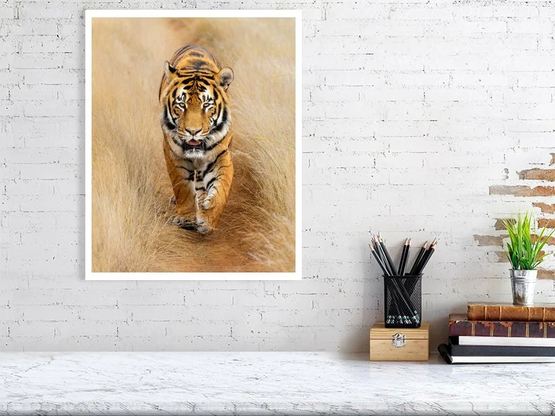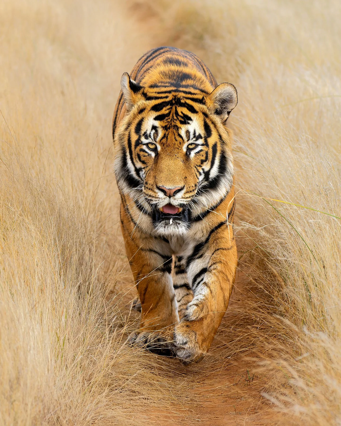 Looking into they eyes of this impressive male tiger walking towards the camera