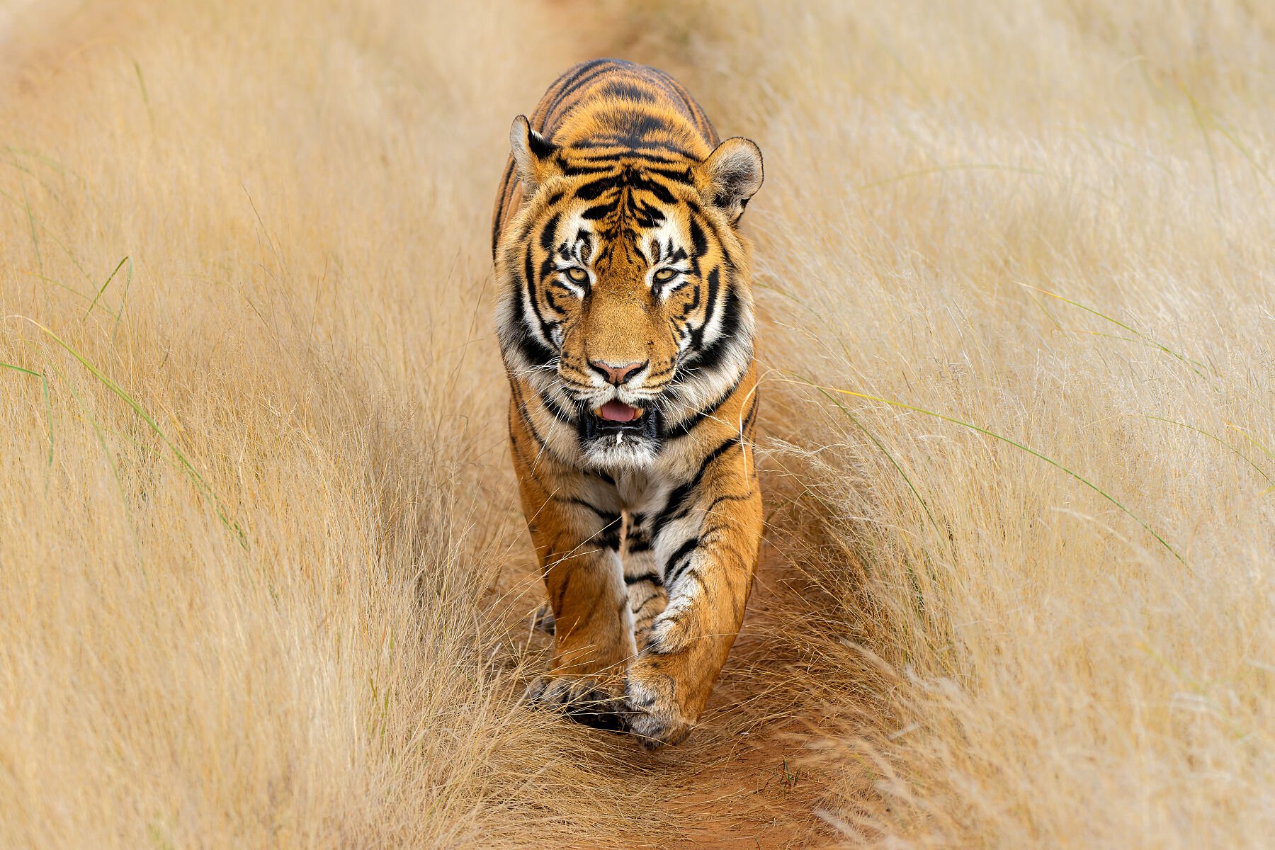 Looking into they eyes of this impressive male tiger walking towards the camera