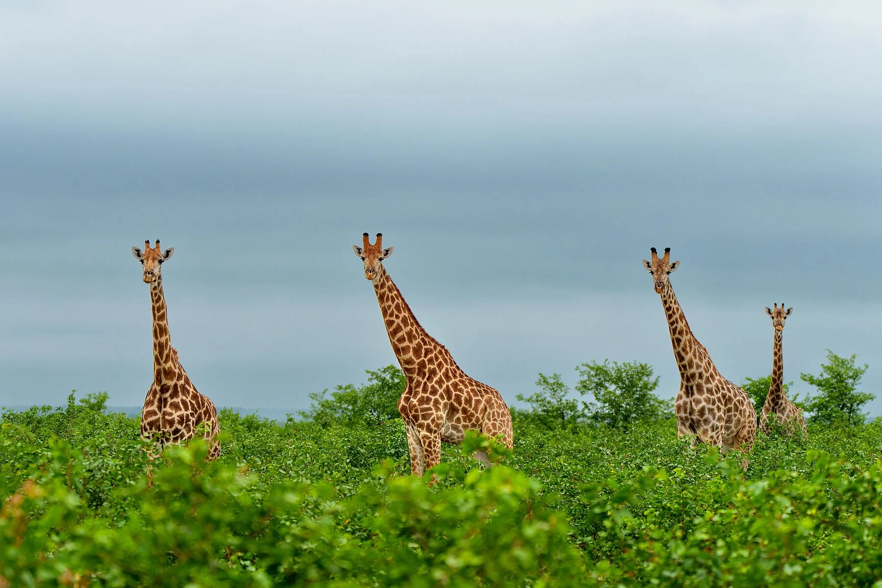 Four giraffes pause their meal among the fresh green leaves of the mopane trees in the northern Kruger National Park, near Shingwedzi. Their long necks rise above the vibrant canopy as they momentarily stop feeding. This brief moment of connection captures the gentle nature and quiet presence of these towering browsers in one of Africa’s wildest landscapes.