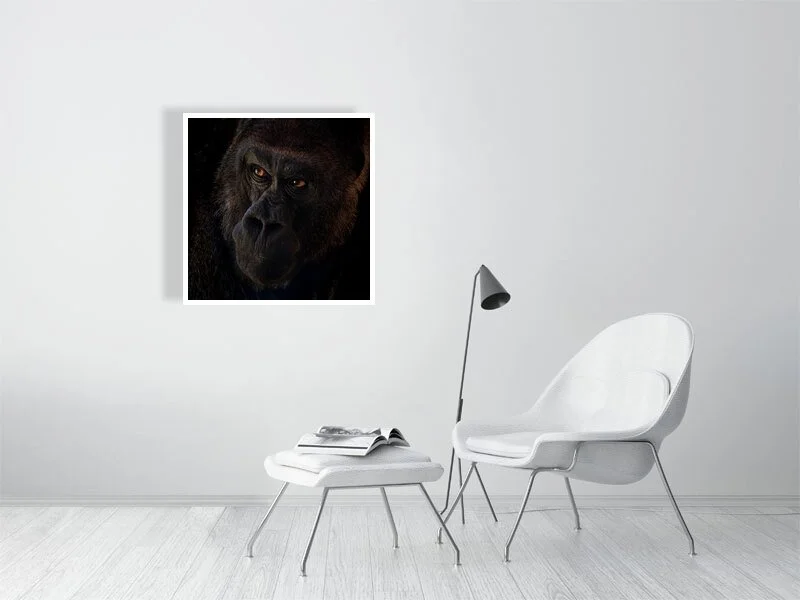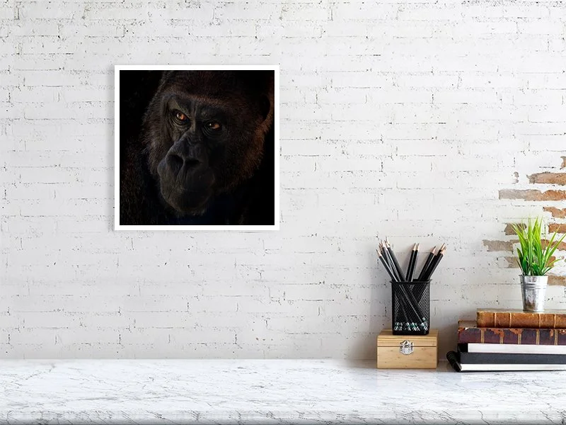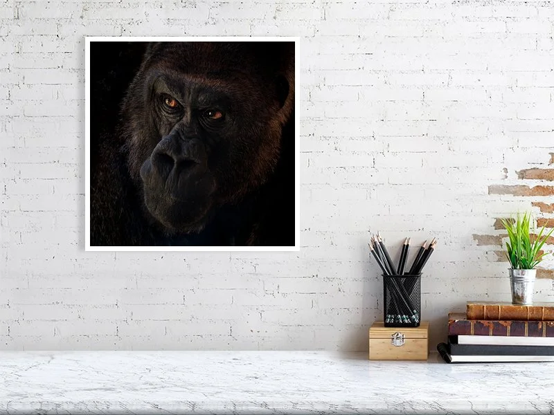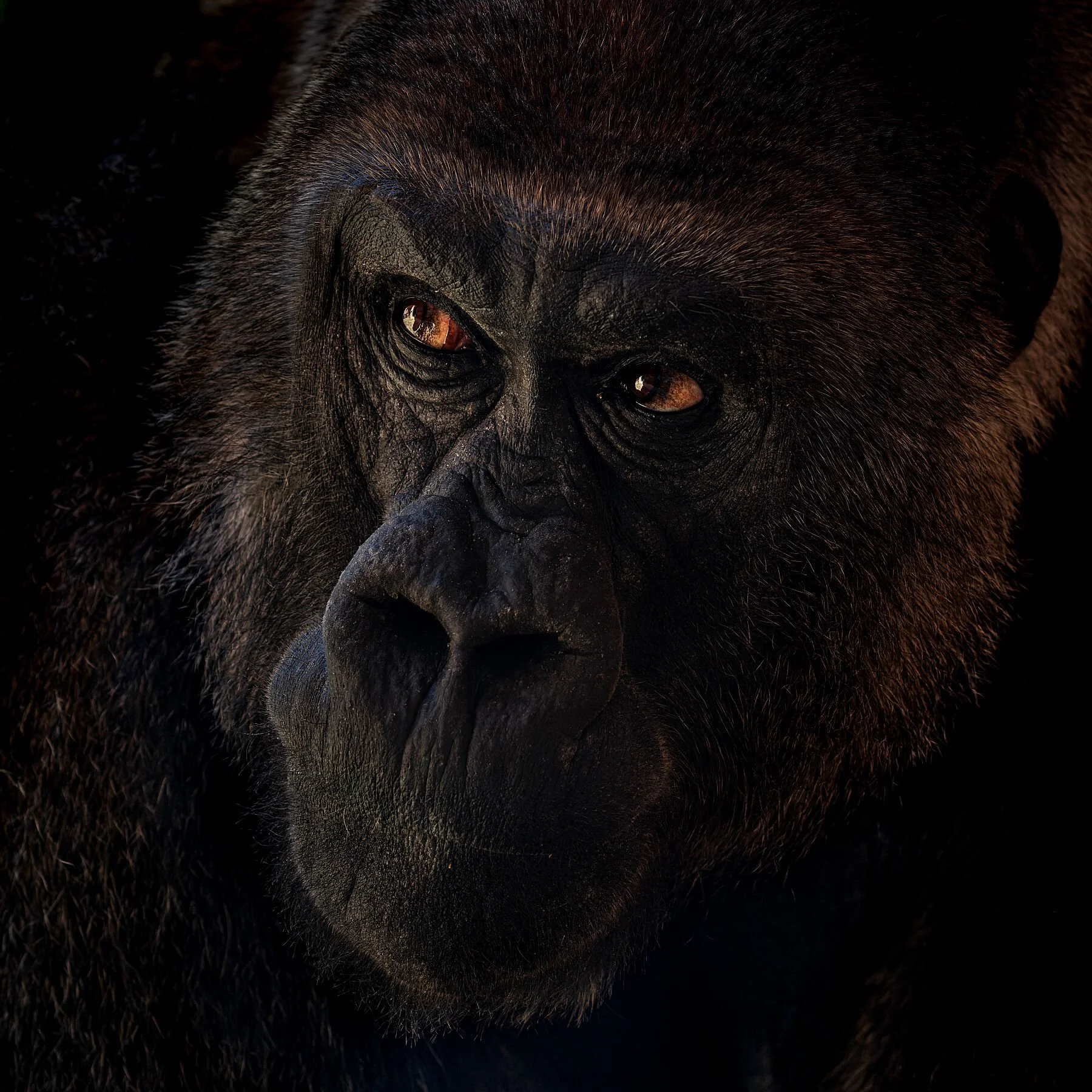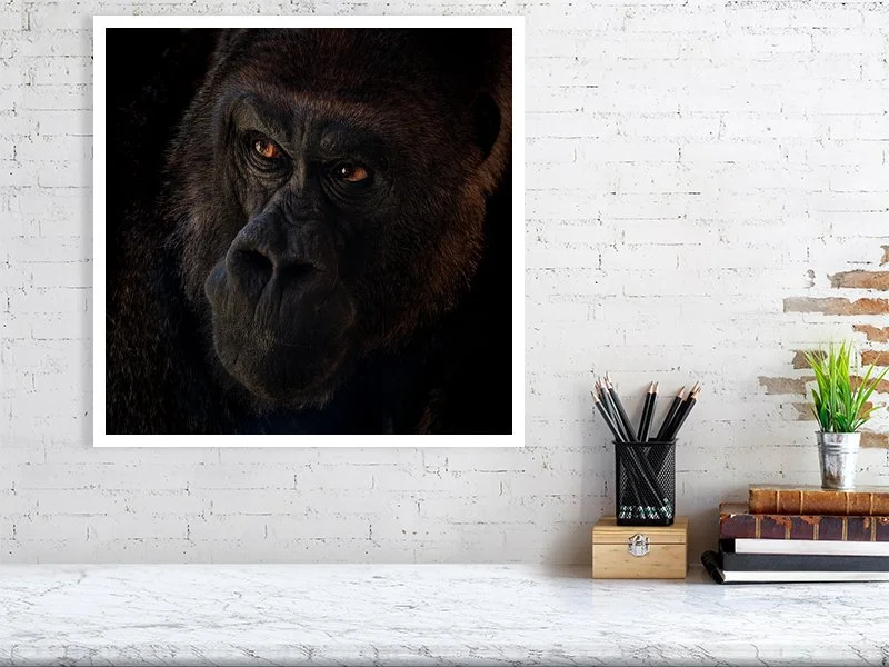 A powerful portrait of a Western Lowland Gorilla silverback, captured in a quiet, introspective moment. Though he does not look directly into the camera, there is a profound depth in his gaze that evokes a deep emotional connection. His eyes, gentle yet wise, reveal a sense of presence that goes beyond the image itself. They seem to reflect something universal, reminding us that the eyes truly are windows to the soul. In that fleeting moment, his gaze reached beyond the lens and touched something deeply human.