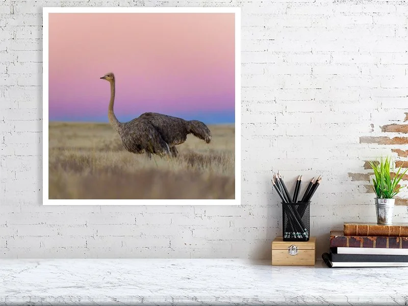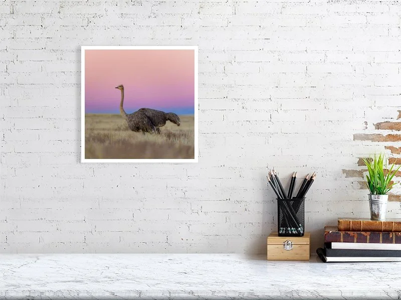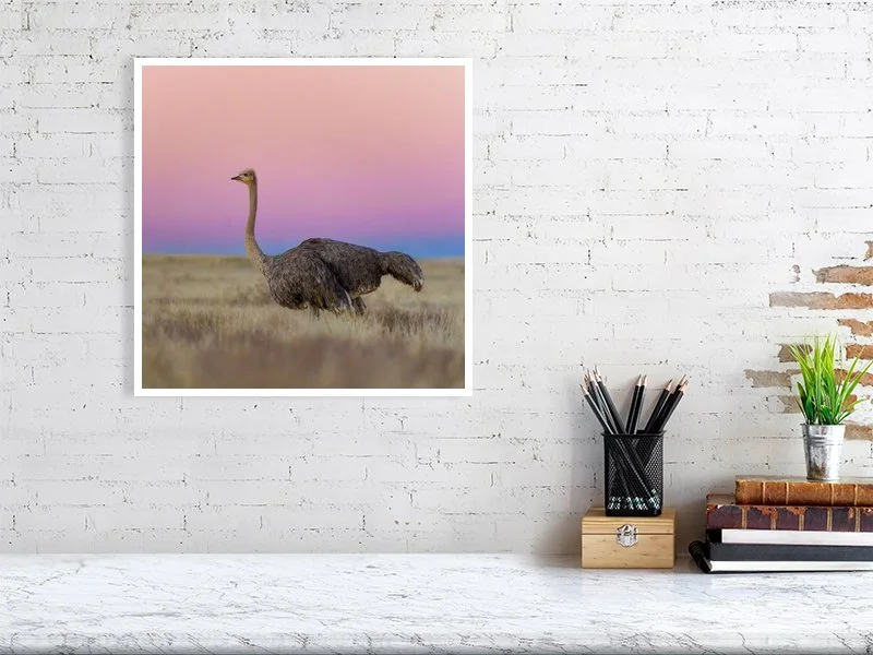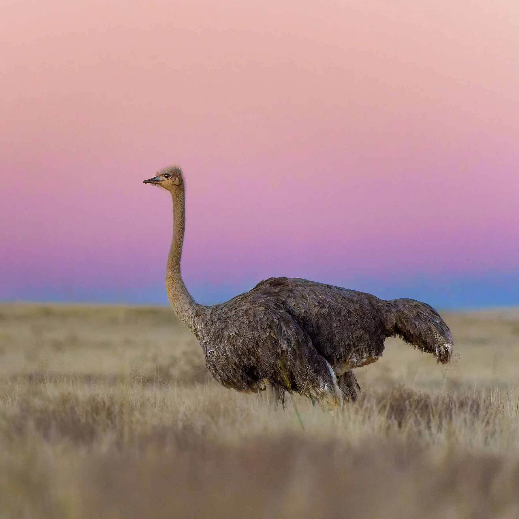 A female ostrich walking on the hills of the Karoo landscape just after sunset when the sky turns into beautiful pastel colours with the Earth’s shadow.
