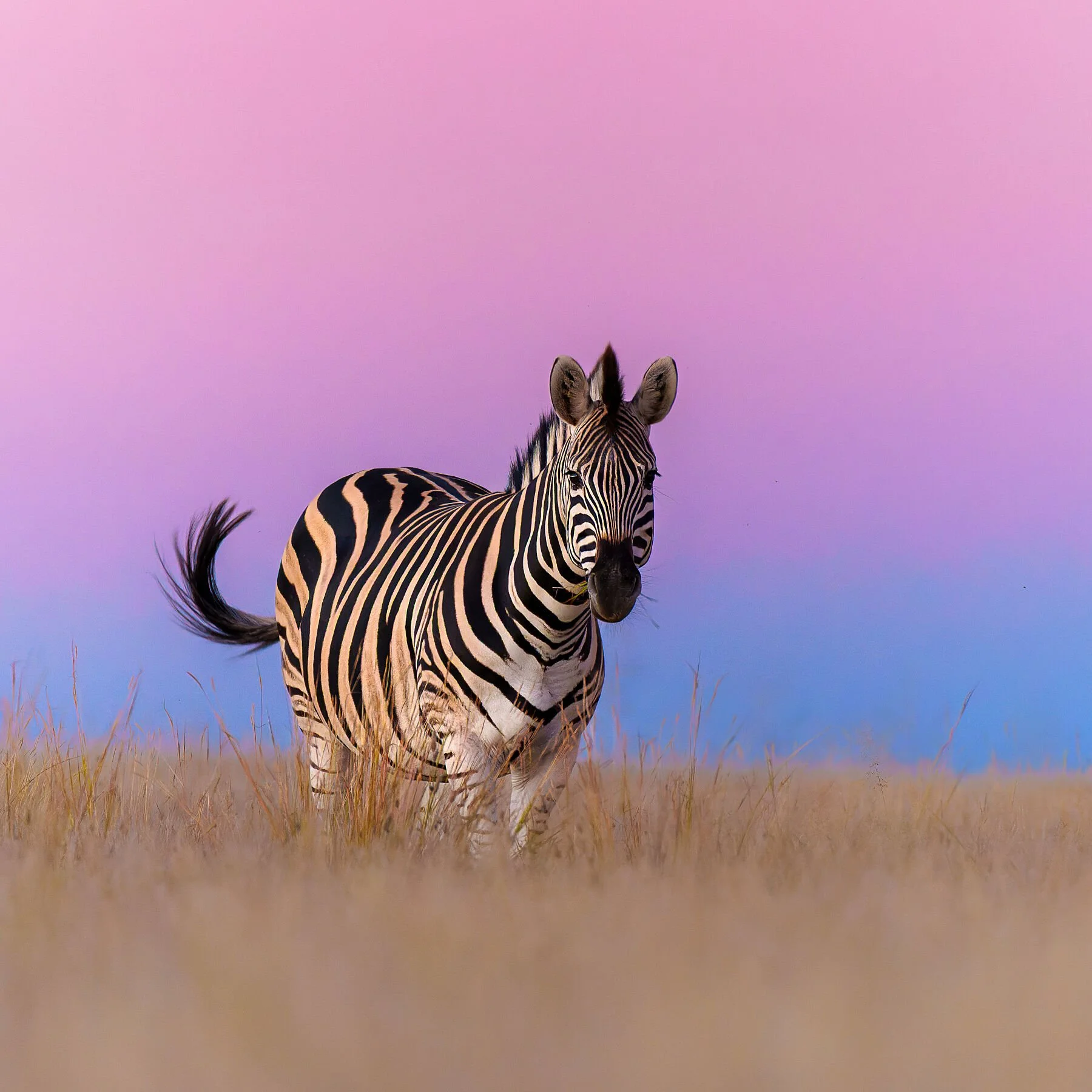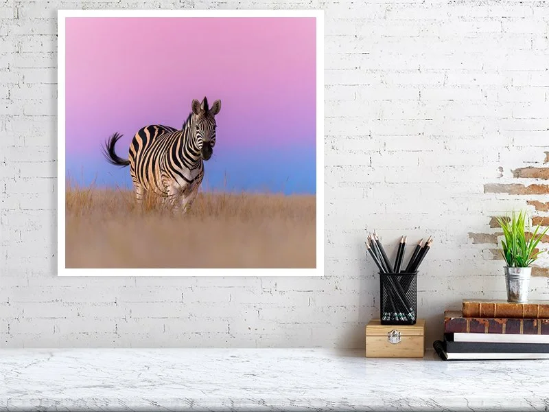 A zebra grazes peacefully on the rolling hills of the Karoo in South Africa, just after sunset, when the sky softens into dreamy shades of pink, blue, and purple as Earth’s shadow rises. The tranquil scene highlights the quiet beauty of the landscape and the gentle contrast between the zebra’s bold stripes and the pastel evening glow.