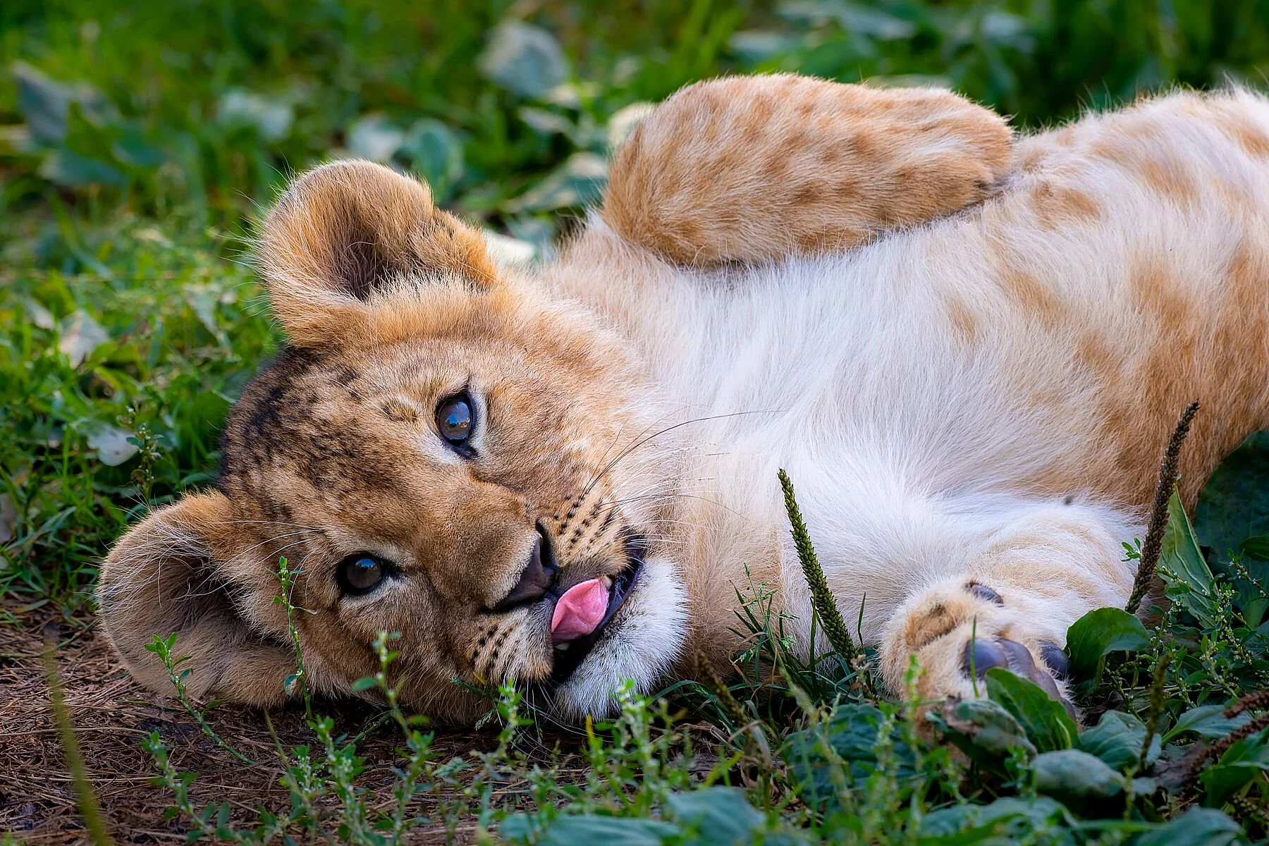A lion cub lies on its back, sticking out its tongue in a playful, cheeky gesture, full of mischief and charm.